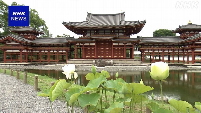 世界遺産になっている京都府宇治市の平等院という寺で、ピンクや赤などのはすの花が咲いています。